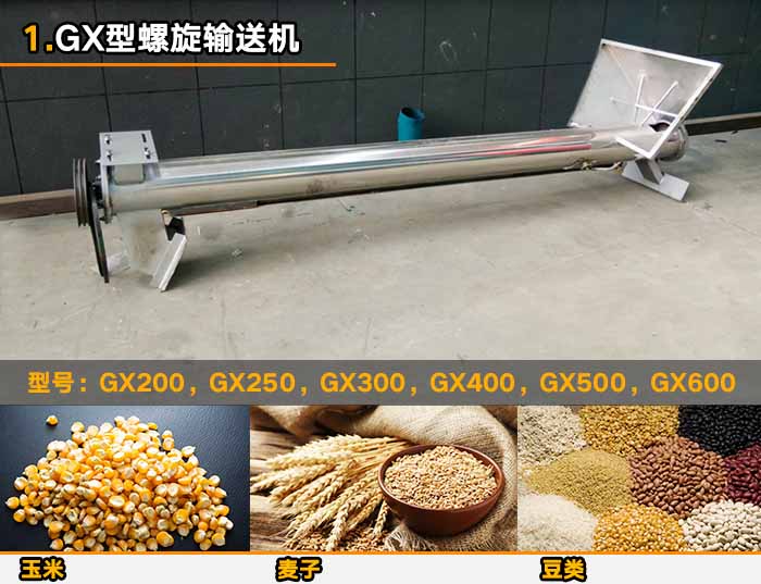 GX型螺旋輸送機是較老的螺旋輸送設備,其有單管于雙管兩種形式,適用于水平的輸送傾斜角不能夠超過20°。可輸送一些塊狀的(小塊狀物料)例如:麥子,玉米,黃豆等糧食。