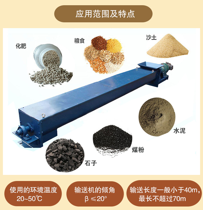 (2)螺旋輸送機使用的環境溫度為—20~50℃ ;輸送機的傾角β≤20°;輸送長度一般小于40m,最長不超過70m。