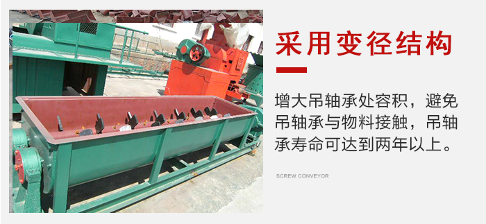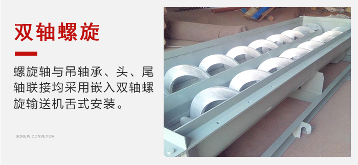 螺旋軸與吊軸承、頭、尾軸聯(lián)接均采用嵌入雙軸螺旋輸送機(jī)舌式,安裝、拆卸不需要軸向移動(dòng),維修方便。芯軸長(zhǎng)、吊掛少、故障點(diǎn)少。