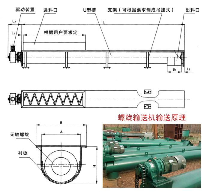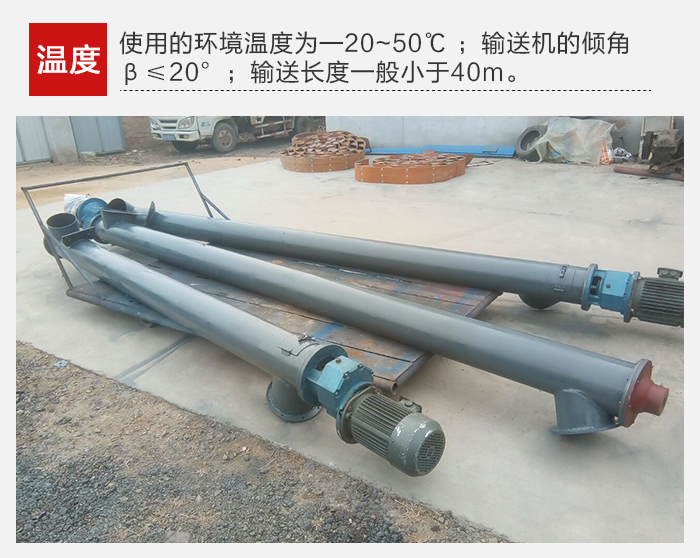 2、螺旋輸送機(jī)使用的環(huán)境溫度為—20~50℃ ;輸送機(jī)的傾角β≤20°;輸送長(zhǎng)度一般小于40m,最長(zhǎng)不超過(guò)70m。
