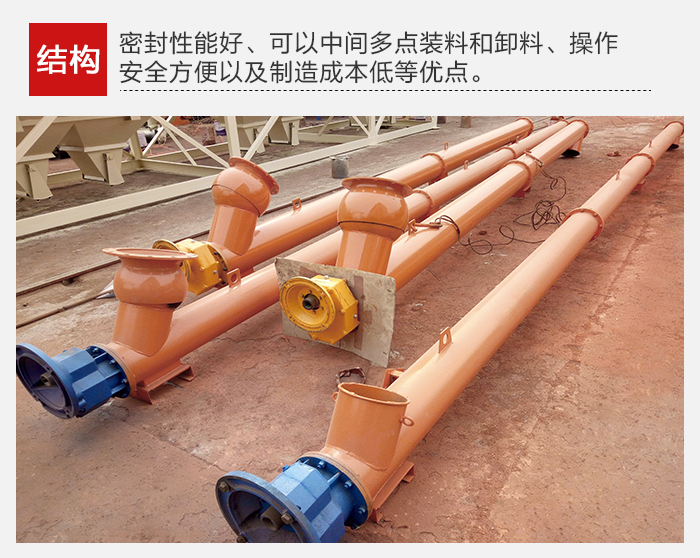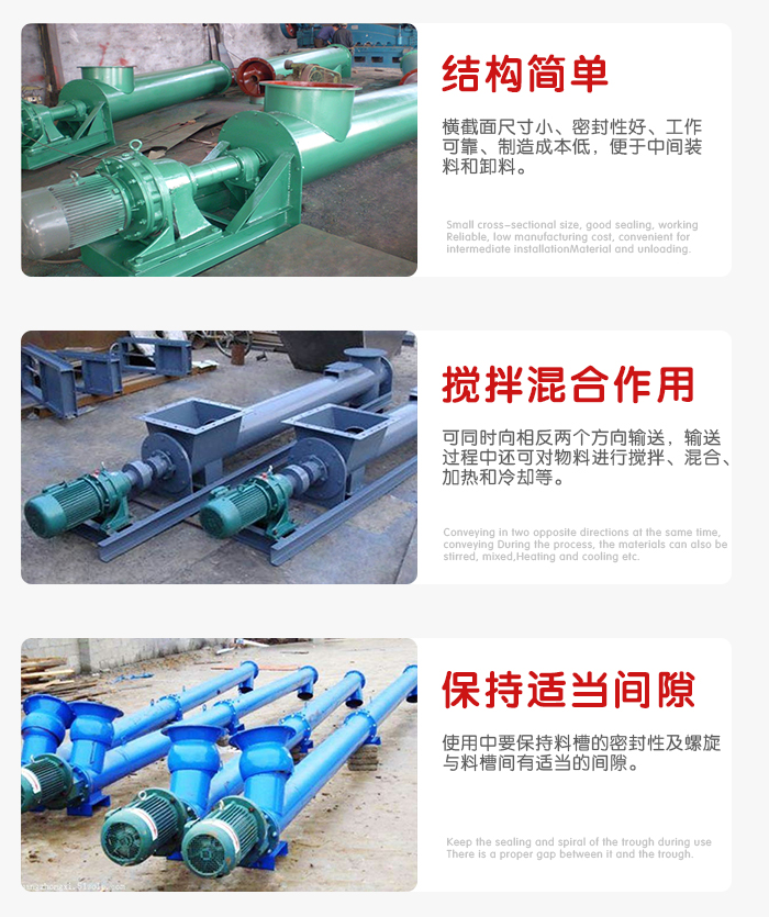結(jié)構(gòu)簡(jiǎn)單、橫截面尺寸小、密封性好、工作可靠、制造成本低,便于中間裝料和卸料,輸送方向可逆向,也可同時(shí)向相反兩個(gè)方向輸送。輸送過(guò)程中還可對(duì)物料進(jìn)行攪拌、混合、加熱和冷卻等作業(yè)。通過(guò)裝卸閘門可調(diào)節(jié)物料流量。但不宜輸送易變質(zhì)的、粘性大的、易結(jié)塊的及大塊的物料。輸送過(guò)程中物料易破碎,螺旋及料槽易磨損。單位功率較大。使用中要保持料槽的密封性及螺旋與料槽間有適當(dāng)?shù)拈g隙。