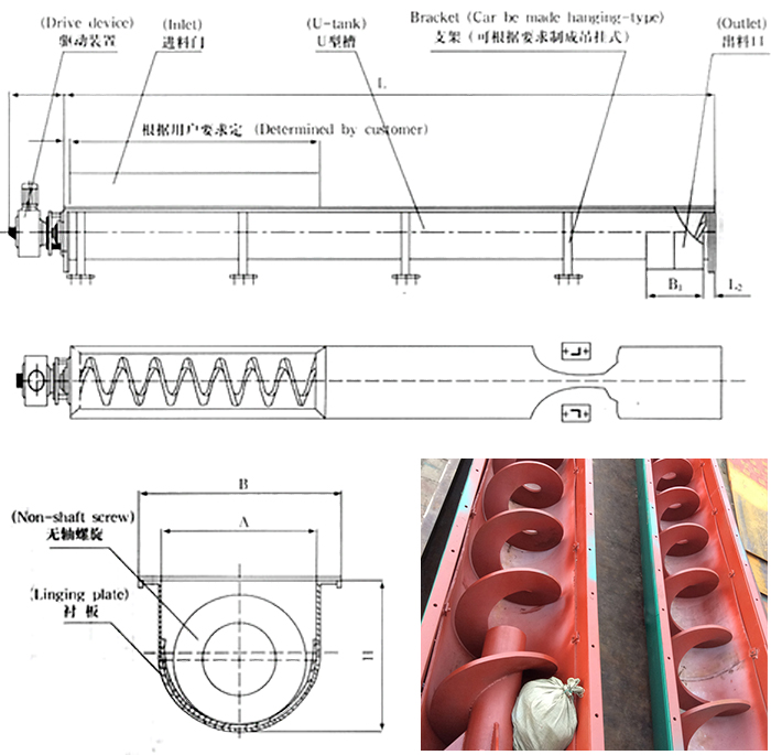 無軸螺旋絞龍輸送機由無軸螺旋、U型槽、襯板、蓋板、進出口和驅動裝置組成。