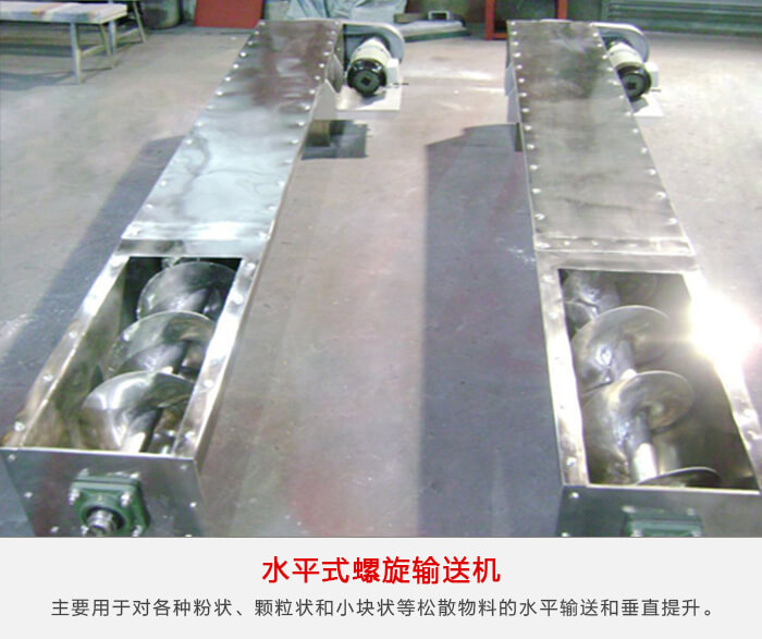 主要分為水平式不銹鋼螺旋輸送機(jī)和垂直式螺旋輸送機(jī),主要用于對各種粉狀、顆粒狀和小塊狀等松散物料的水平輸送和垂直提升。