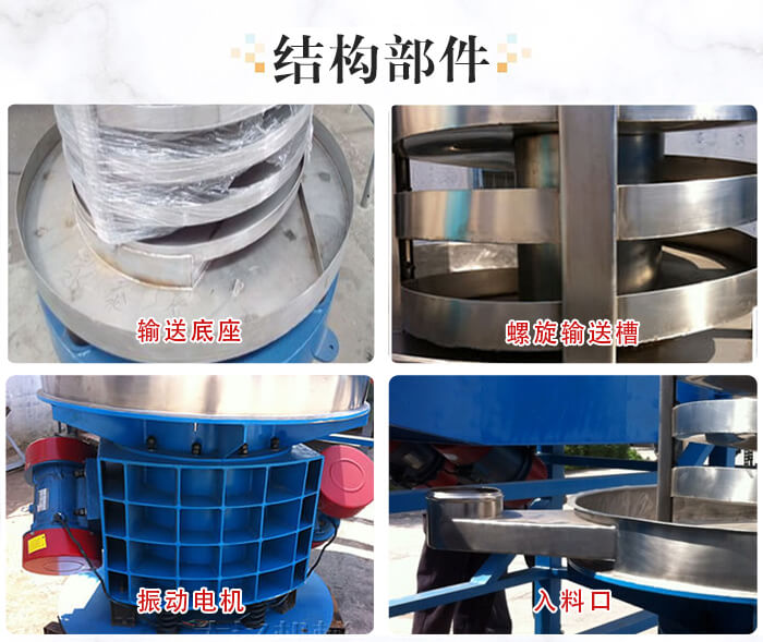 垂直螺旋提升機的主要結(jié)構(gòu)由:進出料口、法蘭、減振系統(tǒng)、振動電機和底座這幾部分組成。
