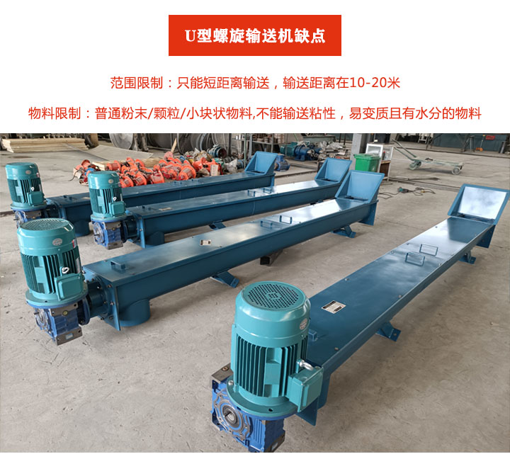 輸送物料限制:U型螺旋輸送機(jī)一般用于粉末,顆粒,小塊狀物料的輸送;不適合輸送粘性大,易變質(zhì)/結(jié)塊以及含水量大的物料。