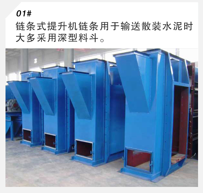 簡介:鏈條式提升機鏈條用于輸送散裝水泥時大多采用深型料斗