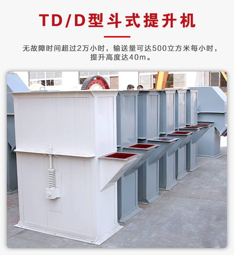 TD型斗式提升機由運行部分料斗與牽引膠帶、帶有傳動滾筒的 上部區段,帶有拉緊滾筒的下部區段,中間機殼,驅動裝置,逆止制動裝置等組成。無故障時間超過2萬小時,輸送量可達500m3/h,提升高度達40m。